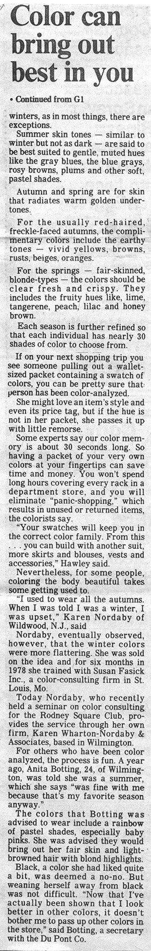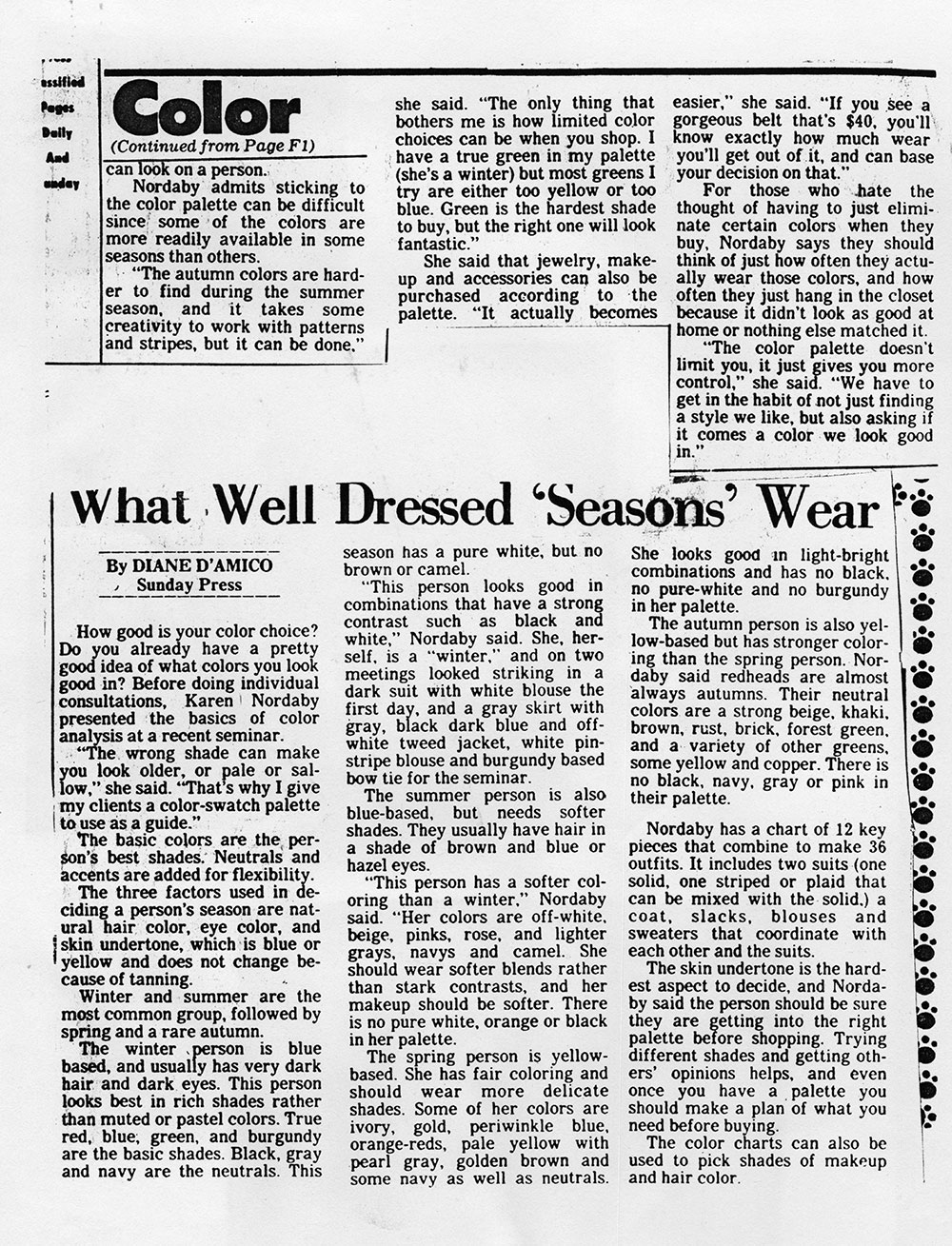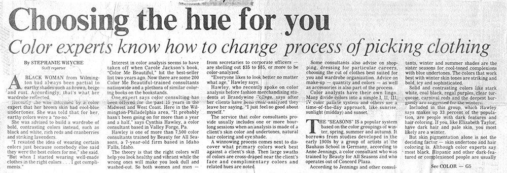 - Using fabric drapes to find out how your hair, eye, and skin tone react to specific colors to determine your season.